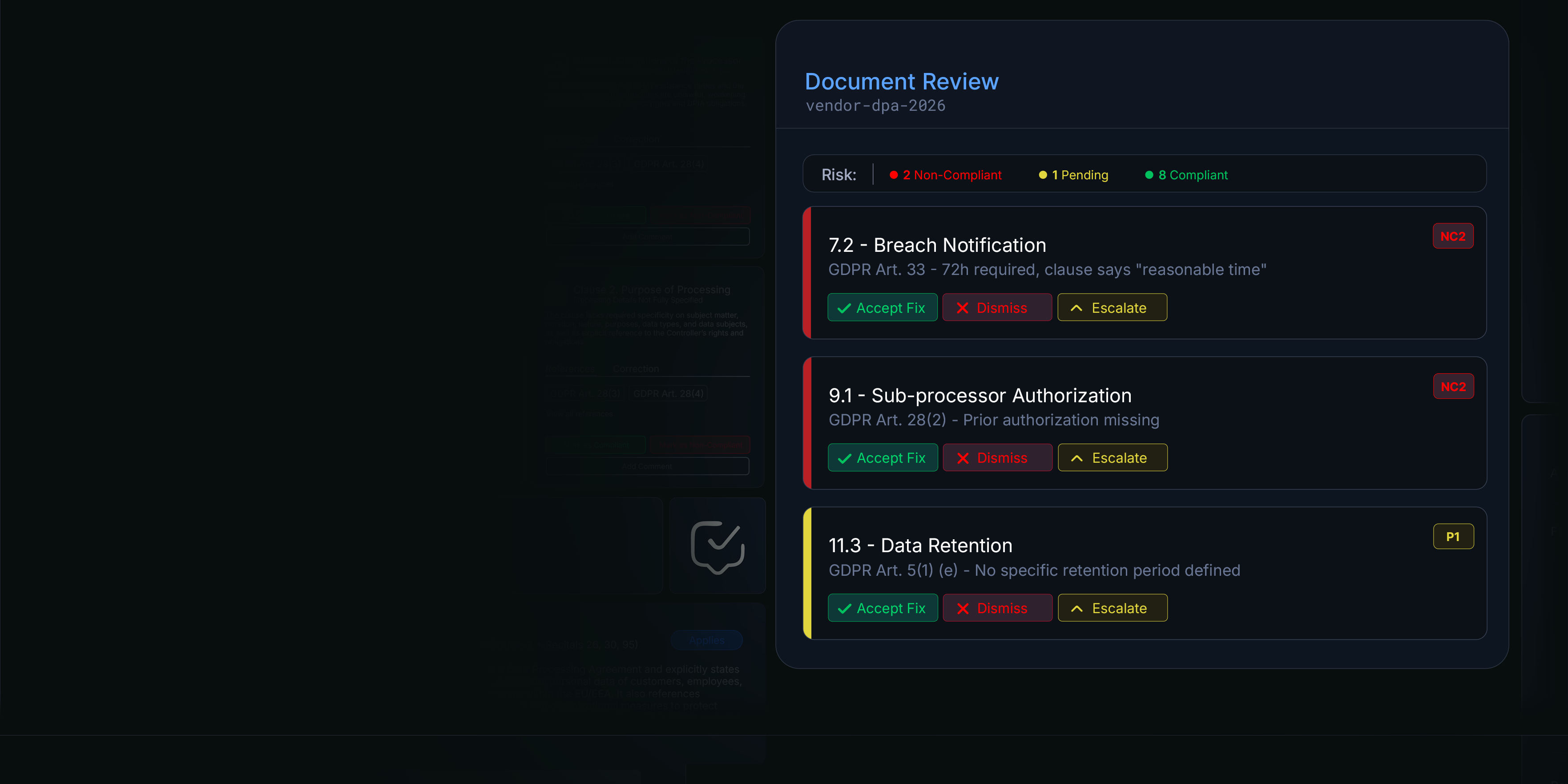 Cross-audit dashboard. Track violations and resolutions across GDPR, AI Act, and more.